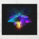 Antique, mechanical firefly with light bulb and thin wings glows orange, purple, turquoise on black background. Steampunk style.