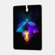 Antique, mechanical firefly with light bulb and thin wings glows orange, purple, turquoise on black background. Steampunk style.