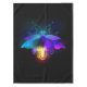 Antique, mechanical firefly with light bulb and thin wings glows orange, purple, turquoise on black background. Steampunk style.