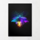 Antique, mechanical firefly with light bulb and thin wings glows orange, purple, turquoise on black background. Steampunk style.