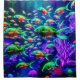 Dive into a neon wonderland with this vibrant underwater design featuring various fish in shades of green and orange swimming among colourful coral and purple luminescent sea plants. The dark background enhances the neon colours, making the fish and sea life stand out in a visually striking and whimsical scene. Perfect for adding a touch of aquatic magic and colour to any space, this artwork captures the beauty and vibrancy of marine life.