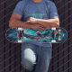 "Surf the concrete waves with the 'Neon Flux: Cyber Koi Skateboard Deck,' a fusion of traditional symbolism and cyberpunk innovation. This deck features a mechanically augmented koi fish, gliding through the air currents of a neon-infused cityscape. Its metallic scales are interwoven with pulsating neon lines in electric blue and pink, reflecting the koi's legendary status as a harbinger of prosperity and fortune. Above, flying vehicles crisscross the skyline dotted with holographic ads. The sleek, futuristic deck design, complete with sharp angles and holographic effects, encapsulates the vibrant spirit of a high-tech metropolis. At 2700 x 9900 pixels, every detail is crafted for visual impact and performance."