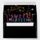 5x7 Sweet Sixteen birthday black glow party envelope lined with bright, random stars that look like glitter in shades of silver, gold, red, pink, and purple. Reads 'Sweet Sixteen' in neon lights effect pink and blue letters. Cute, festive party envelopes for glow in the dark Sweet 16 birthdays, neon party colours, black light party, girls sixteenth birthday party, etc. We have coordinating glow in the dark party invitations and black light birthday supplies in our Zazzle.com/angela65* shop.