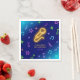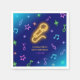 Elegant birthday napkin featuring neon yellow microphone and colourful music notes on dark blue black ground.
