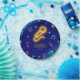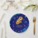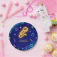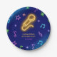 Elegant birthday paper plate featuring neon yellow microphone and colourful music notes on dark blue black ground.