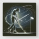 A golfer is poised to hit a ball towards a flag on a golf course surrounded by bright, swirling lines that suggest motion and energy.