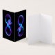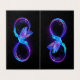 Glowing, purple infinity symbol with flying, luminous, blue hummingbird on black background. Neon.