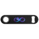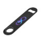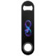 Glowing, purple infinity symbol with flying, luminous, blue hummingbird on black background. Neon.