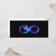 Glowing, purple infinity symbol with flying, luminous, blue hummingbird on black background. Neon.