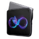 Glowing, purple infinity symbol with flying, luminous, blue hummingbird on black background. Neon.