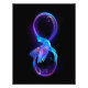 Glowing, purple infinity symbol with flying, luminous, blue hummingbird on black background. Neon.