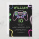 Celebrate a Level 10 milestone with this vibrant neon video game birthday invitation. Featuring a glowing neon game console at the center, the design is enhanced with minimal neon accents in green, yellow, and pink tones. The bold gaming atmosphere creates an exciting and energetic vibe, perfect for young gamers. This modern and eye-catching invitation is ideal for a fun, high energy video game themed birthday party.