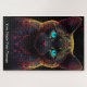 This mesmerizing jigsaw puzzle features a majestic black cat illuminated with glowing neon mandala patterns. The intricate, symmetrical designs flow across its fur in vibrant hues of electric blue, fiery orange, and magenta. The cat's piercing turquoise eyes seem to glow with mystic energy, drawing you into its enigmatic gaze. Set against a deep black background, the vivid lines and radiant details create a dazzling contrast, making each puzzle piece a work of art. A stunning blend of fantasy and elegance, perfect for those who love cats, color, and cosmic mystery.