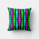 This throw pillow has a mid-century modern design of neon pink, green, and blue rounded rectangles in increasing and decreasing size running vertically on a field of black.