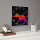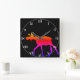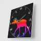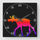 Cute graphic of a neon silhouette of a moose saunters across the black background of this wall clock. The time is marked by white Roman numerals encircled by a double white circular frame.