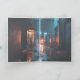This surreal image was created by AI using the prompt shown on the back of the card (which is removable if you desire). It shows an urban scene at night with a neon-coloured nativity scene brightly lit by a fluorescent bulb in a bodega. The card inside shows an urban alley in the background. There is no greeting (blank card), but you can customise it with your own message.