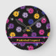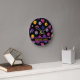 Neon pink, yellow and purple on black pickleball pattern, custom text Round Clock. Perfect as a gift for pickleball player. Customizable text on both sides