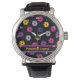 Neon pink, yellow and purple on black pickleball pattern, custom text Watch. Perfect as a gift for pickleball player. Customisable text on both sides