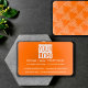 Business card in neon orange solid colour background and a simple cover logo . Personalise the front now . The reverse side is covered with a geometric pattern design .Modern and trendy design by Alma Wad .It comes 100 in a pack . Standard Australian / Japanese business card size .