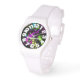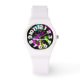 Stand out in the crowd with this cool neon paint splatter splash colourful green, pink, yellow and purple rainbow of colour on black background, wrist watch, personalised with name or text, in bright, fluorescent hues. Make a fun and fresh style statement with this modern retro 80s fashion.