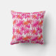 This decorative pillow features a pattern of neon pink and orange palm trees.