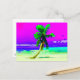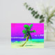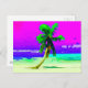 Palm tree on a beach in paradise. Hot pink with neon green and blue. Purple and pink sky with blue water and white sand.