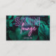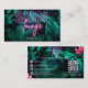 Add your name and contact info to this modern skincare/beautician business card, featuring tropical dark green foliage. The words "Skin" and "lounge" are in purple and pink neon typography with your name underneath it, and your contact details on the back of the card. There's a QR code as well, where you can add your social media URL. Contact the designer if you would like a different colour on the neon text.