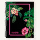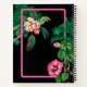 A modern yet retro themed neon pink tropical botanicals on a black background. A beautiful design ideal for summer. Perfect neon pink tropical plants design featuring palm trees, pink Hibiscus flowers and Plumerias Frangipanis flowers. Black, pink, and green colours dominate this tropical pink neon design.