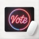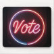 A neon sign displays the word "Vote" inside a circular outline with vibrant pink, red, and blue tones giving it a striking luminescence