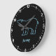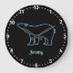 Fun wall clock features "neon" polar bear outline and customisable blue text on black background with white clock face.