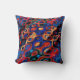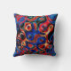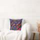 A vibrant, multicolored throw pillow with gold and red swirling ripples.