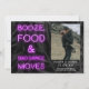 A cool and casual save the date, with neon purple style sign saying, booze, food & bad dance moves on black palm tree leaves tropical background. add one of your favourite photo.