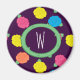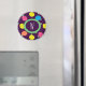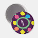 Stylised roses in bright neon pink, blue, yellow, and coral with neon green leaves are spangled across a deep purple background to create a fun floral pattern. Customise the monogram on this magnet for a unique and personalised decoration.