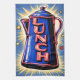A unique take on a vintage Neon sign of a giant coffee pot with the word LUNCH in bold letters. This is a POP Art style with stars and bright lights. this image almost explodes off the towel. This dish towel would be a great gift, decor item or line the inside of baskets. They are as hard working as they are lovely, absorbent and interesting. ENJOY!