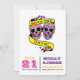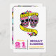 Colourful and bright save the date card featuring two neon patterned skulls.