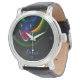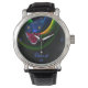 Cool watch, with an abstract neon snake, with a blue head and yellow eyes, against a black background. Personalize the blue text to suit your needs. Great personalized gift idea.