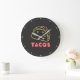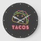 Neon red "Tacos" text with neon crunchy shell taco silhouette on black background with grey dot clock face. Who doesn't love tacos?