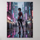 Glowing signs, shimmering puddles, and a gritty backdrop create the perfect stage for this stylised scene. With a balance of danger and beauty, Neon Thorns is perfect for fans of futuristic noir, anime aesthetics, and badass female leads. A bold, atmospheric print that electrifies any wall.