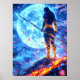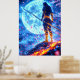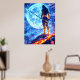 A lone neon warlord stands atop a glowing ridge, his energy-infused spear crackling with cybernetic power. The radiant blue moon casts an ethereal glow as cherry blossoms drift through the neon-lit battlefield. Clad in futuristic armour pulsing with fire and light, he embodies the spirit of a cybernetic knight, blending ancient warrior tradition with electrifying cyberpunk aesthetics.