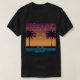 Two wireframe cats sit side by side on a glowing blue grid, gazing at a sky filled with golden light trails and silhouetted palms. The warm horizon and cool foreground create a balanced, futuristic vaporwave mood. A fun choice for cat enthusiasts, gamers and retro-tech art fans.