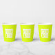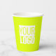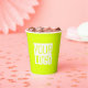 Solid colour Paper Cups in neon yellow- solid colour background and a cover logo . Personalise it now . Modern and trendy design by Alma Wad for company parties .