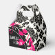 A bold, stylish favour box featuring a glamourous damask pattern of black white and fuschia. Use the "Customise It" button to personalise with your own text. If you need help, please contact me BEFORE you place your order. Email: cheryl@glamprettyweddings.com/contact. Matching invitations, save the dates, paper cocktail napkins. other favour box shapes and many other products available. "Neopolitan Damask Paisley" original design by Cheryl Daniels © 2014.