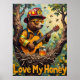 This heartwarming artwork captures a bear dressed in firefighter gear, including a helmet and sunglasses, playing an acoustic guitar while comfortably seated in a bird's nest. Bees fly nearby, and a jar of honey with a small pumpkin rests in the nest. The background features a vibrant forest under a warm sky. The painting's thick, textured strokes add to the endearing quality of the image, with the words "Love My Honey" featured below.