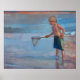 This poster is based on the original oil painting, "Net Working," by Maryann Lucas and features a young boy trying to catch fish with a net at the beach.