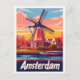 Experience the essence of Amsterdam through a vibrant travel featuring traditional windmills set against a colourful sunset Art Vintage travel place illustration