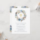 This beautiful baptism or christening invitation for a boy or a girl features a wreath of watercolor flowers in neutral, beige, ivory, and dusty blue shades, and a faux gold cross in the centre. The back of the card features matching blue floral bouquets in the corners.