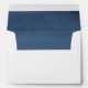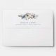These trendy and beautiful wedding envelopes feature watercolor flowers in neutral, beige, ivory, and dusty blue shades and elegant blue text. The interior of the envelope has a rich, deep blue watercolor look.