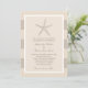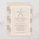 The "Shoreline Chic" wedding invitation in a 5 x 7 portrait format features stylish beachy cabana stripes, a starfish illustration, and neutral beige, sand, and taupe brown colour scheme. Simple and elegant style, perfect for a seaside wedding destination.