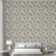 This botanical wallpaper features flowing floral and leaf motifs in a smoky green‑gray set against a soft warm beige background. The stylized blossoms and curved stems create a gentle, organic rhythm that feels calm and inviting. The muted palette adds a touch of modern boho elegance, making this design a beautiful fit for cozy bedrooms, serene living spaces, and nature‑inspired interiors. Its understated colors and graceful pattern bring a soft, cottagecore‑friendly warmth and movement to any room.
