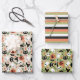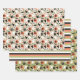 A set of wrapping paper sheets for Halloween featuring three cute patterns: one with cats, pumpkins, skulls, bats, toadstools, witch hats, and leaves against a neutral background; the same pattern against an olive green background; and one sheet with matching stripes.